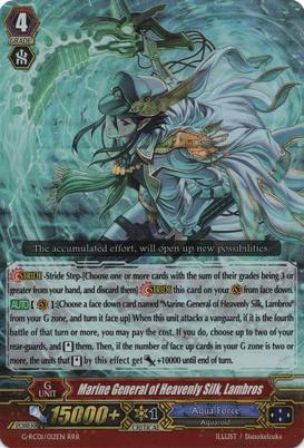 RRR / SPAuto [V]: [Choose a face down card named 「Marine General of Heavenly Silk, Lambros」 from your G zone, and turn it face up] When this unit attacks a vanguard, if it is the fourth battle of that turn or more, you may pay the cost. If you do, choose up to two of your rear-guards, and [Stand] them. Then, if the number of face up cards in your G zone is two or more, the units that [Stand] by this effect get [Power] +10000 until end of turn.