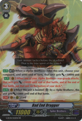 Auto [Limit Break (4)]: When a 《Spike Brothers》 rides this unit, choose your vanguard, and until end of turn, that unit gets [Power] +10000 and 「Auto [V]: When one of your 《Spike Brothers》 rear-guards attacks, that unit gets [Power]+10000 until end of that battle, and at the end of that battle, put that unit on the bottom of your deck.」.