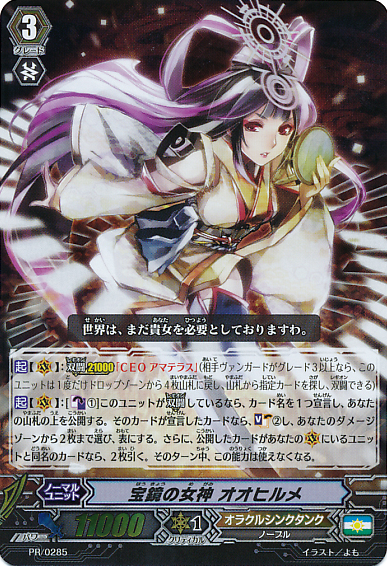 Auto: [Counter Blast (1)] When this unit is placed on [R], you may pay the cost. If you do, choose three cards with 「Regalia」 in its card name from your drop zone, and put them into your soul. Then if the number of cards in your soul is ten or more, put the top card of your deck into your damage zone.