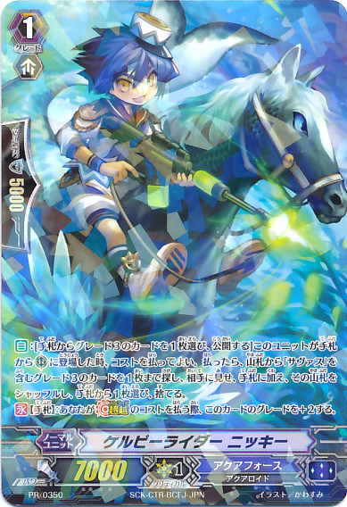 Auto [R] [1/Turn]: At the end of the battle that this unit attacked a vanguard, if you have an «Aqua Force» vanguard, [Stand] this unit, and this unit gets [Power]-5000 until end of turn.