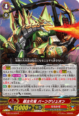 Auto [R] [Generation Break (1)]: [Soul Blast (1) & Retire this unit] During a battle that this unit boosted and the attack hits a vanguard, you may pay the cost. If you do, choose of your unit, search your deck for up to one card with the same card name as that unit, call it to [R], and shuffle your deck. If that unit have the bloom ability, it gets [Power] +4000 until end of turn.