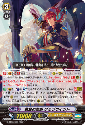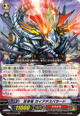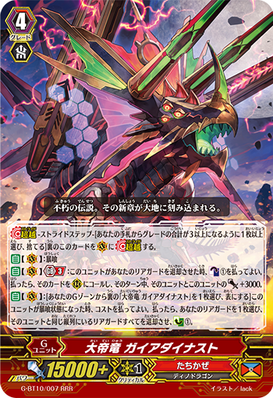 Auto [V]: [Choose a face down card named 「Great Emperor Dragon, Gaia Dynast」 from your G zone, and turn it face up] When this unit becomes engorged, you may pay the cost. If you do, choose one of your rear-guards, retire all of the rear-guards in the same column as that unit, and [Counter Charge (1)].