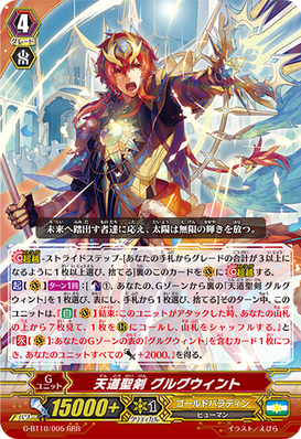 Auto [V]: [Counter Blast (1)] During your turn, when your G unit 「Stride」, you may pay the cost. If you do, choose up to two cards from your hand, call them to separate [R], choose up to two of your rear-guards, and until end of turn, they get 「Auto: When this unit is put into the drop zone from [R] during your turn, call this card to [R].」.