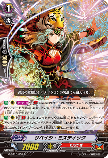 Auto [R] [1/Turn] [Generation Break (1)]: When another rear-guard is [Stand] due to the card ability of your vanguard with in its card name, [Stand] this unit, and this unit gets [Power] +3000 until end of turn.