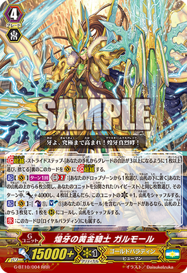 Activate [V] [Limit Break (4)] {This ability is active if you have four or more damage}: [Counter Blast (3) - Card with 「Liberator」 in its card name] Look at the top card of your deck, search for up to one 《Gold Paladin》 from among them, call it to an open [R], and put the rest on the bottom of your deck. If you called, and you have an open [R], repeat this effect without paying the cost.