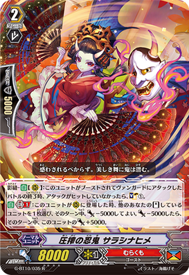 Auto [R]: When this unit attacks a vanguard, if you have a vanguard with 「Hyakki」 in its card name, this unit gets [Power] +2000 until end of that battle.
