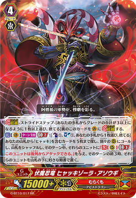 Auto [R]: [Soul Blast (1) & Retire this unit] When this unit's attack hits a vanguard, you may pay the cost. If you do, choose one of your rear-guards, and [Stand] it.