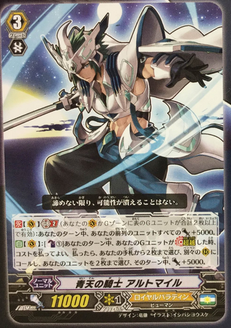 Normal/2/Intercept/9000/5000/1Auto [Generation Break (1)] {This ability is active if you have one or more face up G units in total on your [V] or G zone}: When this unit is placed on [R], if you have a vanguard with 「Altmile」 in its card name, choose one of your other units, that unit and this unit get [Power] +2000 until end of turn.