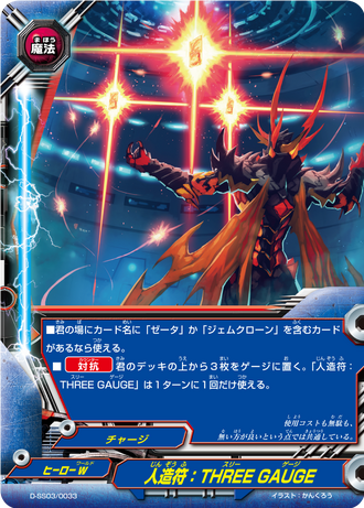 - [Counter] Put the top 3 cards of your deck into the gauge. You may only cast "Artificial Talisman: THREE GAUGE" once per turn.
