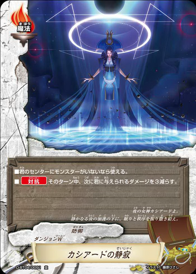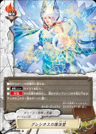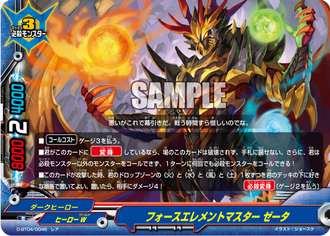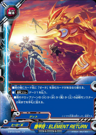 - When this card attacks, you may put a 《Fire》, a 《Water》, a 《Wind》, and an 《Earth》 from your drop zone on the bottom of your deck in any order. If you do, deal 4 damage to your opponent!