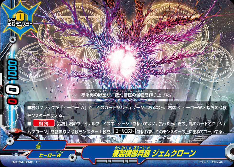 - [Counter] [Activate] During your final phase, you may pay 1 gauge. If you do, call an Impact Monster that does not have "Gemclone" in its card name from your hand on top of this card without paying its [Call Cost].R