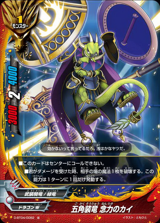 - [Counter] [Activate] During an attack on your opponent's turn, pay 1 gauge. If you do, call this from your hand to your center, and change the target of the attack to this monster.