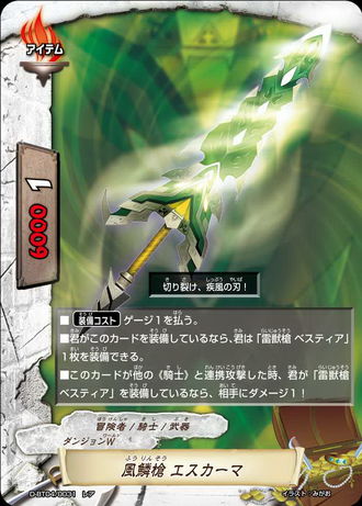 - When this card link attacks with another 《Knight》, if you have an "Wind Scaled Spear, Eskamal" on your field, destroy a monster or item on your opponent's field.
