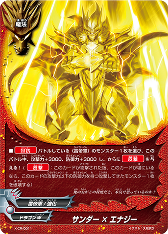 - [Counter] Choose a 《Thunder Empire》 monster in battle, for this battle, give it power+3000, defense+3000, and [Counterattack]! ([Counterattack]: If this card is still on the field after an attack, choose a monster that attacked with defense less than or equal to this monster's power, and destroy it.)