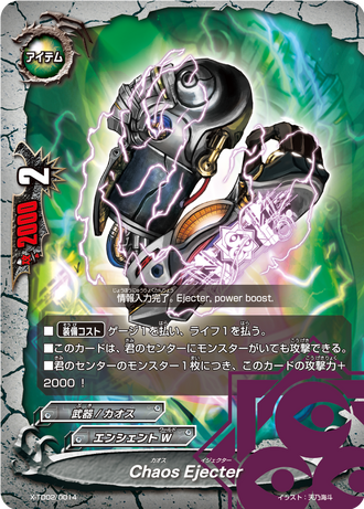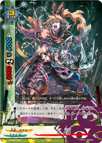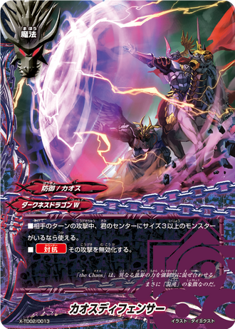 X-TD02/0013EN- [Counter] Choose a 《Chaos》 monster in battle, and for this battle, give it power+3000, defense+3000, and [Counterattack]! ([Counterattack]: If this card is still on the field after an attack, choose a monster that attacked with defense less than or equal to this card's power, and destroy it.)