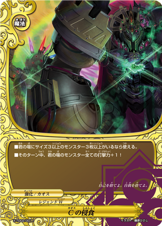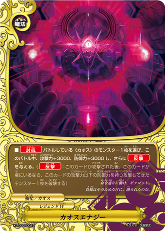 - [Counter] Choose a 《Chaos》 monster in battle, and for this battle, give it power+3000, defense+3000, and [Counterattack]! ([Counterattack]: If this card is still on the field after an attack, choose a monster that attacked with defense less than or equal to this card's power, and destroy it.)