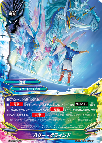 - [Counter] Choose a 《Prism Dragon》 in battle, and for this battle, give it power+3000, defense+3000, and [Counterattack]! ([Counterattack]: If this card is still on the field after an attack, choose a monster that attacked with defense less than or equal to this card's power, and destroy it.)