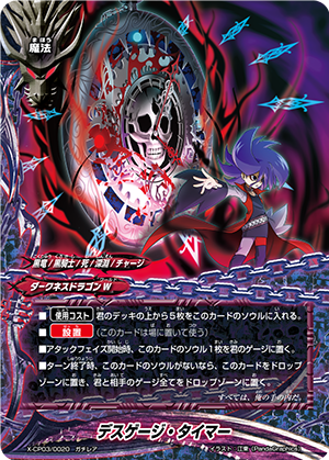 - At the end of turn, if there are no cards in this card's soul, put this card into your drop zone, and all cards from each fighter's gauge into the drop zone.