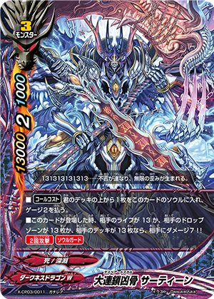 - When this card enters the field, if your opponent has 13 life, or if there are 13 cards in your opponent's drop zone, or if there are 13 cards in your opponent's deck, deal 7 damage to the opponent!!