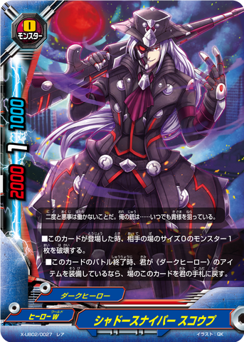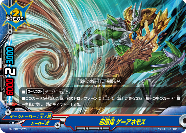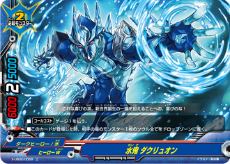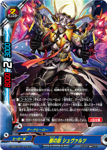 - At the end of the battle of this card, if you have no monsters on your field, choose a size 2 or less《Darkhero》 monsters from your drop zone, and you may pay 1 gauge. If you do, call the chosen card by paying its [Call Cost]. You may only use this ability once per turn.