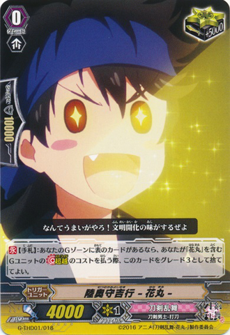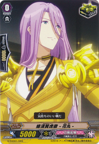 Auto [V]: [Counter Blast (1)] When your G unit 「Stride」 during your turn, you may pay the cost. If you do, draw a card, choose up to one card with 「Hanamaru」 in its card name from your hand, call it to [R], and it gets [Power] +3000 until end of turn.