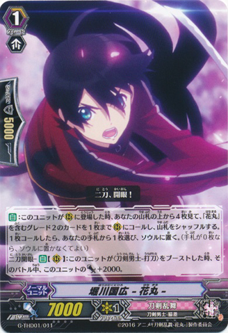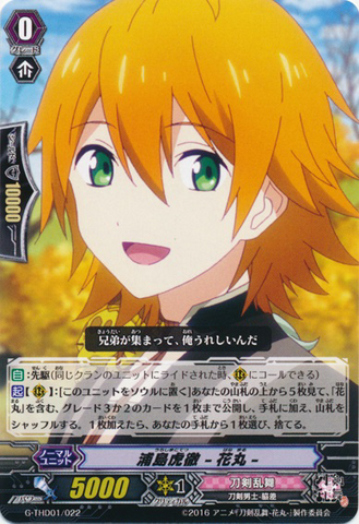 Auto: When this unit is placed on [R], look at four cards from the top of your deck, and reveal up to one grade 1 card with 「Hanamaru」 in its card name. You may [Counter Blast (1)]. If you do, call the revealed card to [R]. Shuffle your deck.