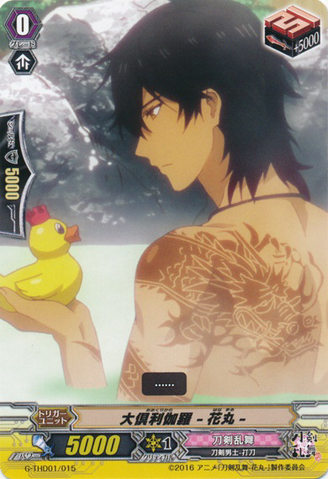 Auto [R]: When this unit attacks a vanguard, if you have another <Touken Danshi - Uchigatana> or <Touken Danshi - Wakizashi> unit, this unit gets [Power] +2000 until end of that battle.