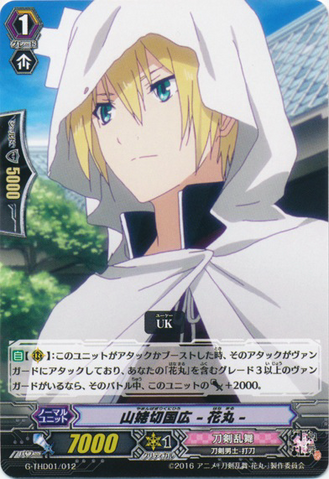 Auto [R]: When this unit attacks or boosts, if the attack is attacking the vanguard and you have a grade 3 or greater vanguard with 「Hanamaru」 in its card name, this unit gets [Power] +2000 until end of that battle.