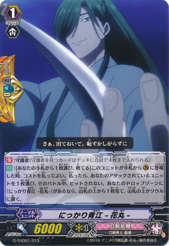 Auto: [Choose a card from your hand, and discard it] When this unit is placed on [G] from hand, you may pay the cost. If you do, choose one of your units that is being attacked, and it cannot be hit until end of that battle. If you have a 「Nikkari Aoe -Hanamaru-」 in your drop zone, look at the top card of your deck, and put it into your soul or on the top of your deck.