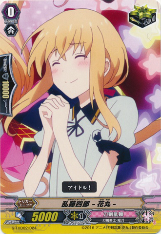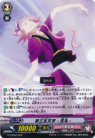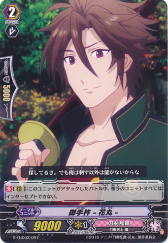Auto [V]: [Counter Blast (1)] When your G unit Stride」, you may pay the cost. If you do, [Soul Charge (1)], look at three cards from the top of your deck, call up to one card with 「Hanamaru」 in its card name to [R] from among them, and it gets [Power] +2000 until end of turn. Shuffle your deck.