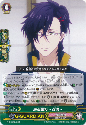 Continuous [Hand]: If you have a face up card in your G zone, while you are paying the cost for Stride a G unit with 「Hanamaru」 in its card name, you may discard this card as a grade 3 card.