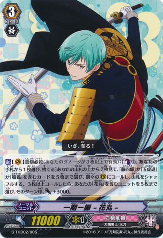 Activate [V] [1/TurnShinken Hissatsu {This ability is active if you have three or more damage}: [Counter Blast (1) & Soul Blast (1) & Choose a face down 「Nihongou -Hanamaru-」 from your G zone, and turn it face up] Until end of turn, this unit gets [Power] +10000, and for the battle that this unit attacked, your opponent cannot call grade 1 or greater cards from hand to [G].
