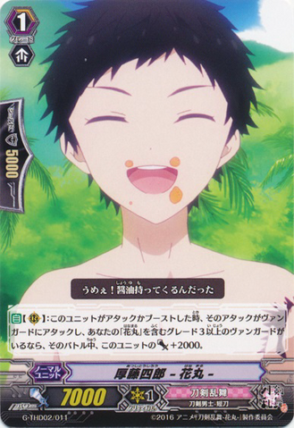 Auto [R]: When this unit attacks or boosts, if the attack is attacking the vanguard and you have a grade 3 or greater vanguard with 「Hanamaru」 in its card name, this unit gets [Power] +2000 until end of that battle.