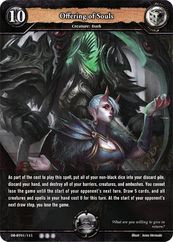 As part of the cost to play this spell, put all of your non-black dice into your discard pile, discard your hand, and destroy all of your barriers, creatures, and ambushes. You cannot lose the game until the start of your opponent's next turn. Draw 5 cards, and all creatures and spells in your hand cost 0 for this turn. At the start of your opponent's next draw step, you lose the game.