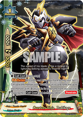 [Overturn] [During your turn, discard a card from your hand] Call up to one monster with "Tsukikage" in its card name and up to one monster with "Byakuya" in its card name from your deck by paying their [Call Cost], and shuffle your deck!!