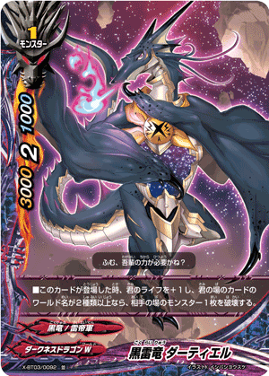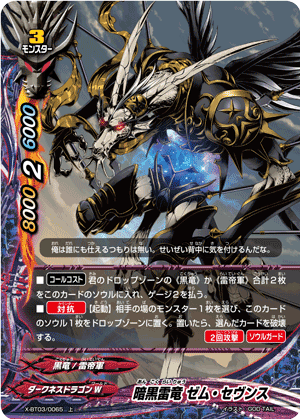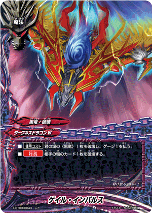 - [Call Cost] [Put up to one 《Black Dragon》 from your drop zone into this card's soul & Pay 1 gauge] At the end of your opponent's turn, if you have a 《Black Dragon》 [Set] on your field, put the top two cards of your deck into your gauge, and you gain 2 life!