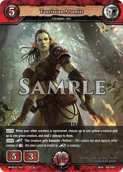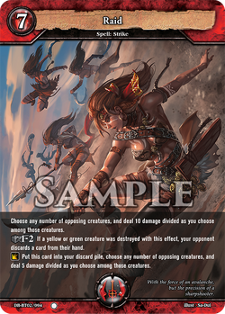 [AUTO] When this creature deals damage to a fort, if you have two or more red creatures, you may discard a card from your hand. If you do, choose an opposing creature, and deal 3 damage to it.