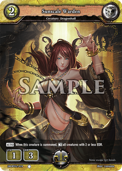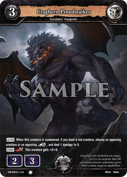 [AUTO] When this creature is summoned, if you have a red creature, choose one opposing creature or an opposing [Dragoshield], and deal 1 damage to it.