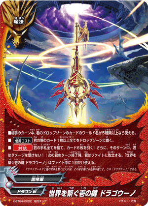 - [Counter] Discard your entire hand, and draw six cards. Then, for this turn, you cannot be dealt damage. At the end of your next turn, you lose the game. You may only cast "A Key That Connects the World, Dragouno" once per fight.