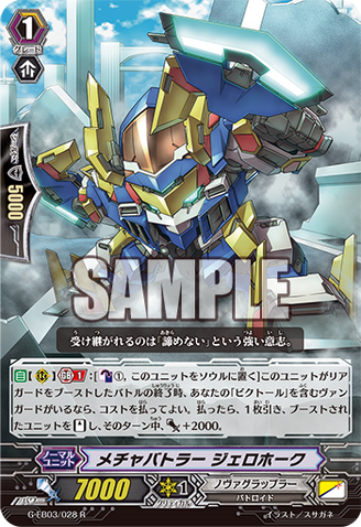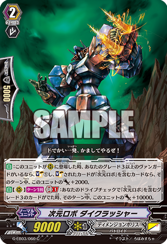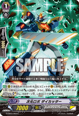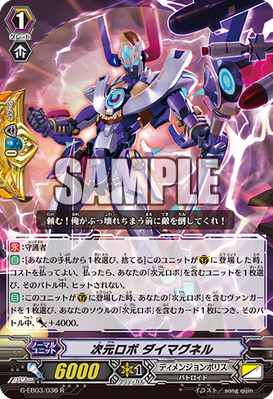 Auto: When this unit is placed on [R], if you have grade 3 or greater vanguard, [Soul Charge (1)], and if the [Soul Charge] card is a card with 「Dimensional Robo」 in its card name, this unit gets [Power] +2000 until end of turn.