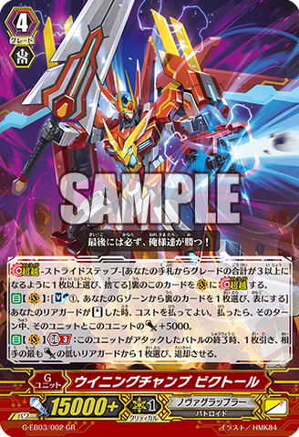 Auto [V]: [Counter Blast (1)] When your G unit 「Stride」 during your turn, you may pay the cost. If you do, draw a card, choose a card from your hand, call it to [R], choose one of your units, and until end of turn, it gets 「Auto [V/R] [1/Turn]: When this unit attacks, choose one of your other rear-guards, and [Stand] it.」.
