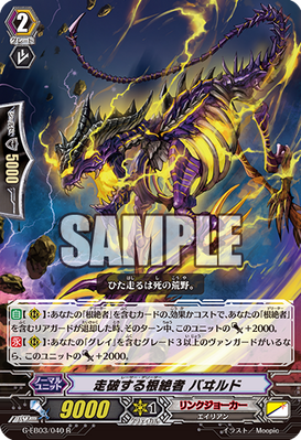 Auto [R]: [Put this unit on the top of your deck] At the end of the battle that this unit boosted, if your opponent has a deleted vanguard, you may pay the cost. If you do, shuffle your deck, [Counter Charge (1)], your opponent chooses a card from his or her drop zone, and binds it face down {vanish delete}.
