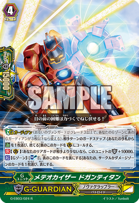 Auto: When this unit is placed on [R], if you have a vanguard with 「Dimensional Robo」 in its card name, look at five cards from the top of your deck, choose up to two grade 3 cards with 「Dimensional Robo」 in its card name from among them, put them into the drop zone, and shuffle your deck. If the number of cards you put into the drop zone is one or more, this unit gets [Power] +4000 until end of turn. If the number of cards you put into the drop zone is two, you draw a card.