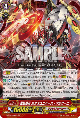 Auto [R]: [Soul Blast (1)] At the beginning of the guard step of a battle when your vanguard with 「Chaos」 in its card name is attacked, you may pay the cost. If you do, move this unit to [G].
