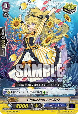 Auto [V]: [Counter Blast (1) & Choose one of your rear-guards or a card from your hand, and put it on the bottom of your deck] When your G unit 「Stride」, you may pay the cost. If you do, look at two cards from the top of your deck, call up to two cards with 「Chouchou」 in their card names from among them to separate [R], and shuffle your deck.
