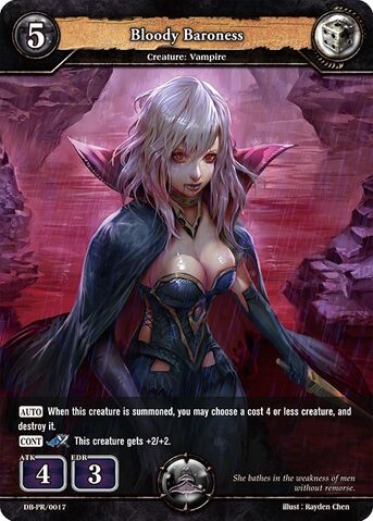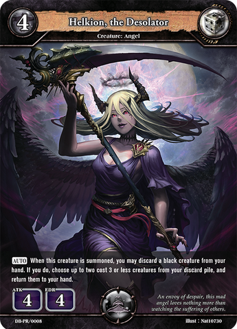 [AUTO] When this creature is summoned, you may discard a black creature from your hand. If you do, choose up to two cost 3 or less creatures from your discard pile, and return them to your hand.