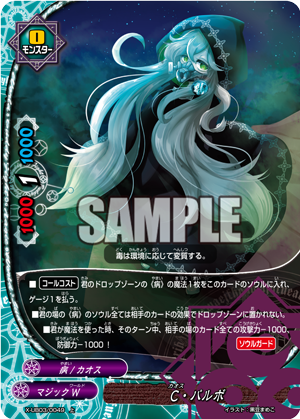 - "Charismagic" When this card enters the field, return two monsters with different name from your drop zone face down, shuffle them, your opponent picks a card at random from among them, and you call a monster that your opponent choose by paying its [Call Cost]. "Charismagic" only activates once per turn. (Return the rest to your drop zone.)