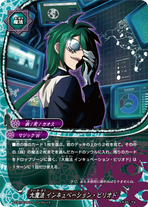 - Choose a card on your field, look at the top two cards of your deck, put up to two 《Plague》 spells from among them into the chosen card's soul, and put the rest into the drop zone. You may only cast "Great Spell, Incubation Period" once per turn.