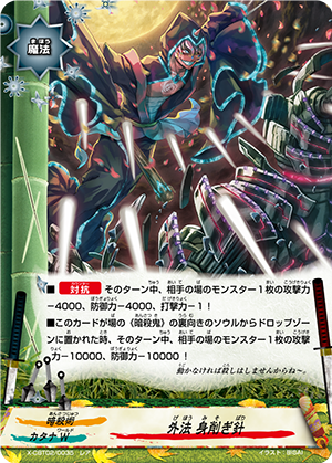 - [Counter] [Activate] Choose a card on the field, and you may pay 1 gauge. If you do, put a soul from the chosen card into the drop zone. You may only use this ability once per turn.