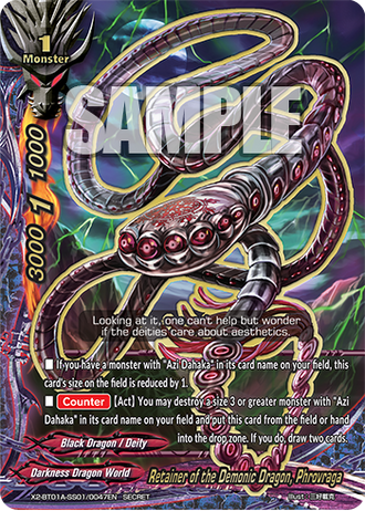 - [Counter] [Activate] During an attack on your opponent's turn, if you have three or more different world names of cards in your drop zone, you may discard this card from your hand. If you do, nullify the attack, and if you have a card with "Azi Dahaka" in its card name in your drop zone, draw a card.